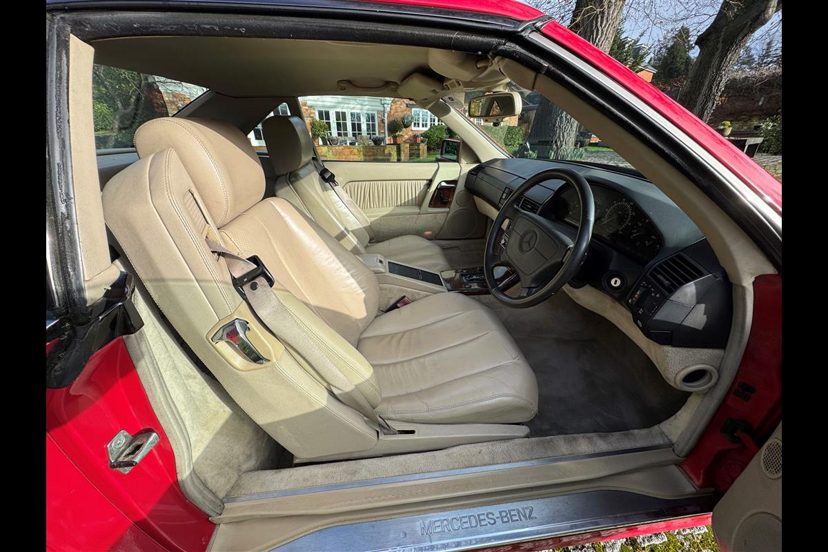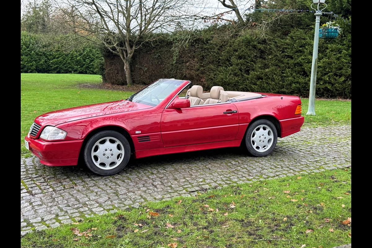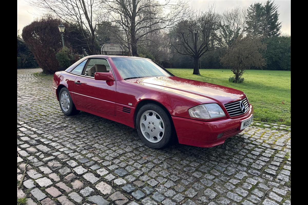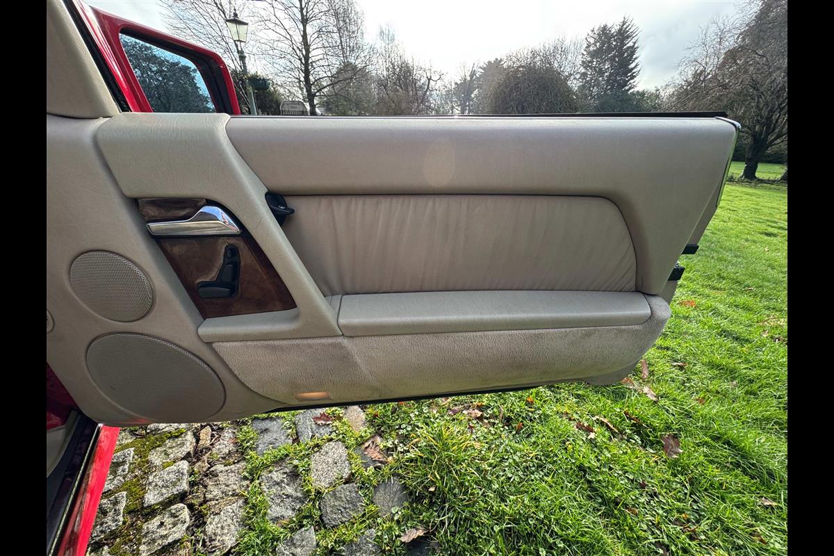 This bright red 1994 Mercedes 280SL has recentley arrived in part exchange against a Bentley Arnage Red Label. Not our normal stock but nevertheless it comes in nice all round condition for an attractive sportscar that is now 32 years old. Mercedes build quality in the early 90's was renowned throughout the motor industry for its superb finish and utter reliability. Both paintwork and interior trim of this motorcar are in very nice condition and judging by the number of service invoices that accompany the car, it has also been well cared for from a mechanical point of view. The interior is very well specified with full leather trim extending to the optional rear seats that are best suited for small children. The interior is complimented with Walnut veneers and the car has a removal hard top, beneath which is an easily errected soft top. The car sits on eight hole Mercedes alloy wheels and is a pleasure to drive. Not expensive in today's market place at £6,950