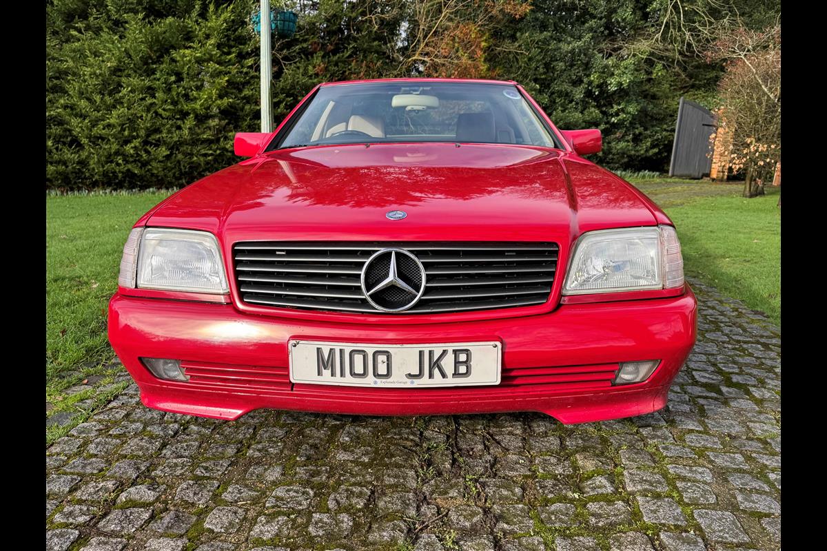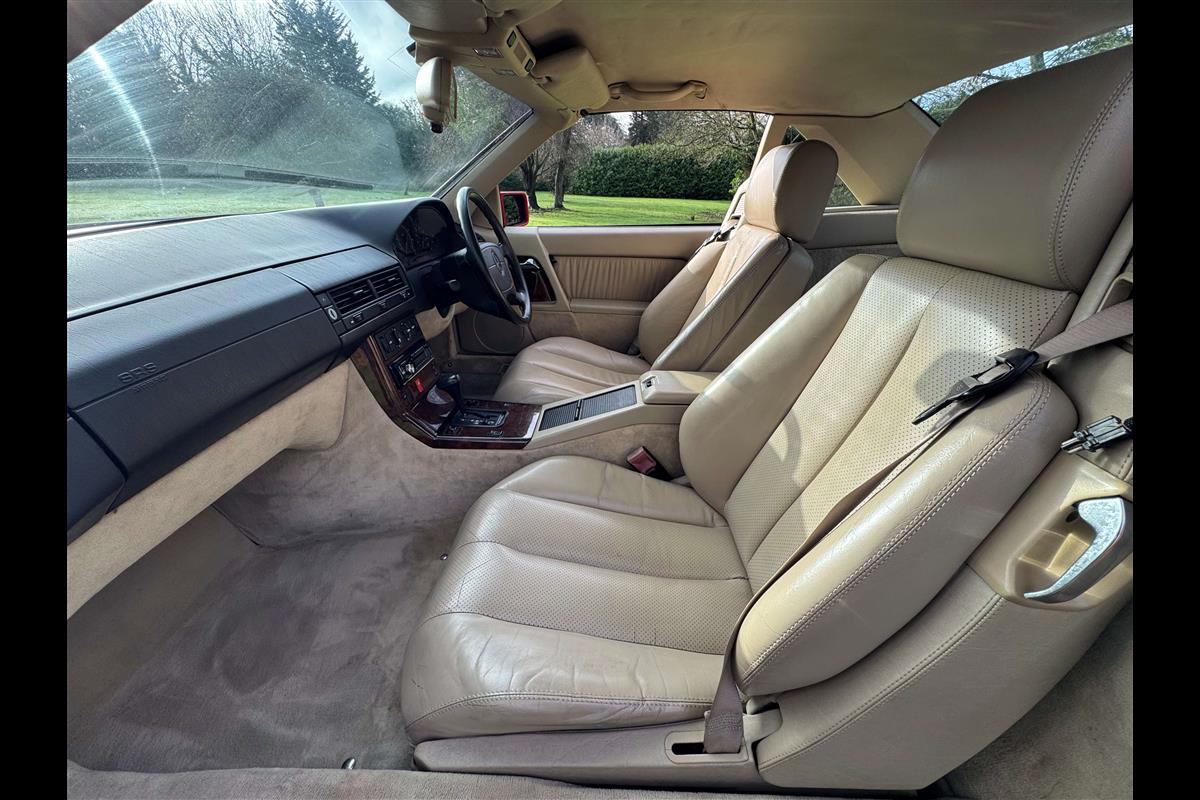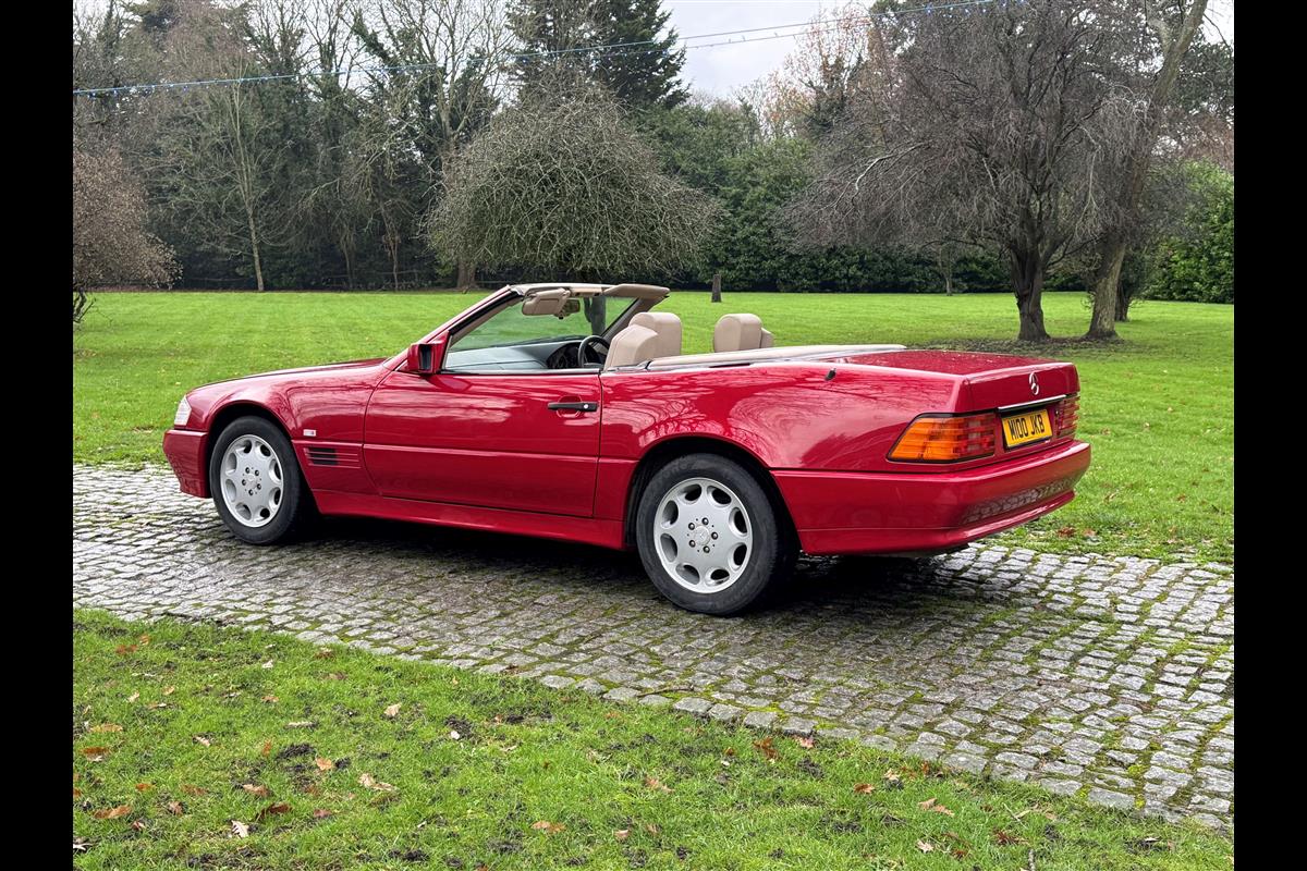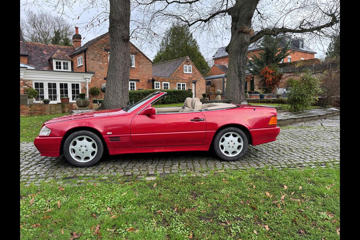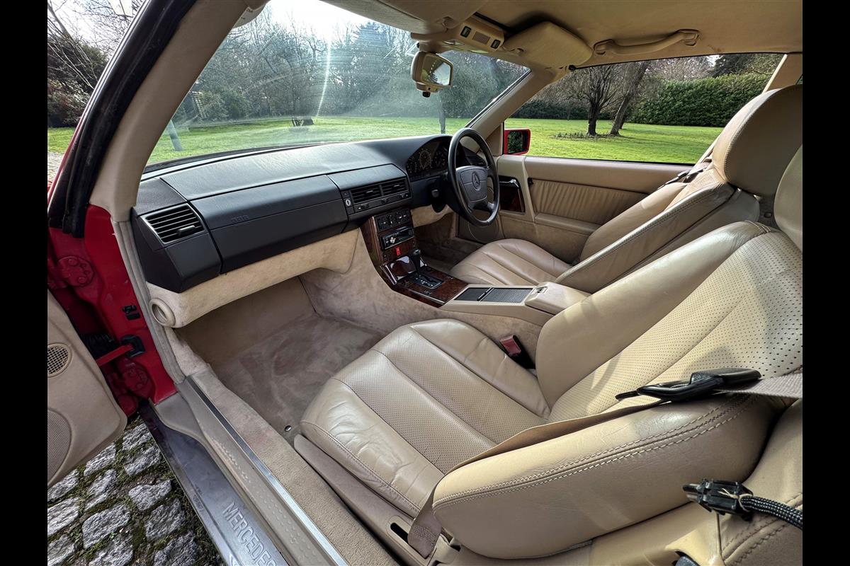 This bright red 1994 Mercedes 280SL has recentley arrived in part exchange against a Bentley Arnage Red Label. Not our normal stock but nevertheless it comes in nice all round condition for an attractive sportscar that is now 32 years old. Mercedes build quality in the early 90's was renowned throughout the motor industry for its superb finish and utter reliability. Both paintwork and interior trim of this motorcar are in very nice condition and judging by the number of service invoices that accompany the car, it has also been well cared for from a mechanical point of view. The interior is very well specified with full leather trim extending to the optional rear seats that are best suited for small children. The interior is complimented with Walnut veneers and the car has a removal hard top, beneath which is an easily errected soft top. The car sits on eight hole Mercedes alloy wheels and is a pleasure to drive. Not expensive in today's market place at £6,950