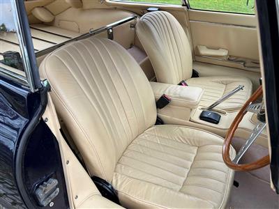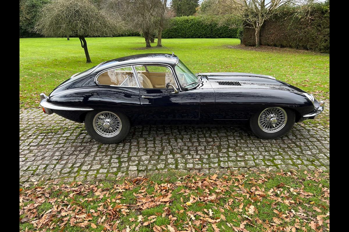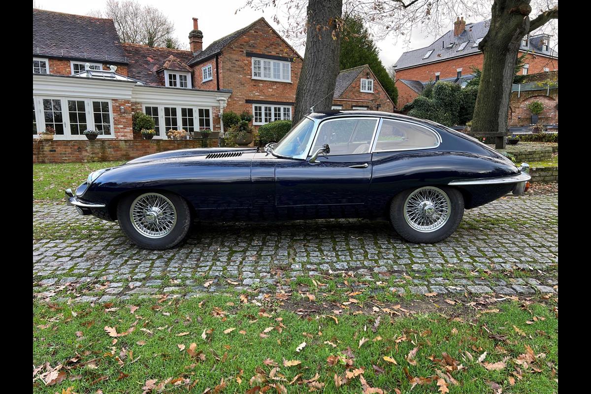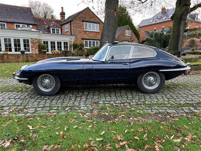 1969 Jaguar E Type Series II 4.2 Fixed Head Coupe, beautifully finished in Dark Blue with contrasting Oatmeal hide interior. It is a matching numbers, UK supplied example as is confirmed by the Jaguar Heritage certificate that accompanies the car. Purchased 24 years ago back in 1999 by the most recent owner, as a drivable car requiring improvement. From the extremely well documented history file dating back to the early 70’s, numerous improvements were carried out between 1999 and 2016 when he decided to “Bite the Bullet” and have a full body restoration carried out. He instructed a very capable restoration company in Canterbury who completely stripped the body and replaced both floor pans and cut out any other corroded areas. A new bonnet was supplied and fitted together with all new ancillaries and the whole car was then repainted to a high standard. The car has remained in very nice condition ever since and the standard of workmanship was excellent throughout the project. Not Expensive at £57,500