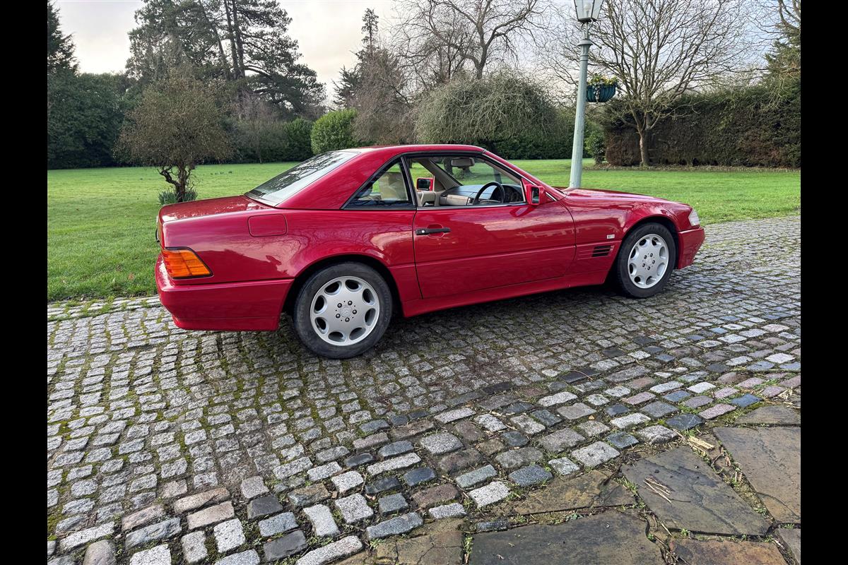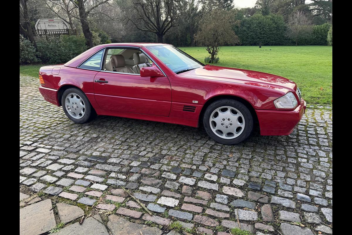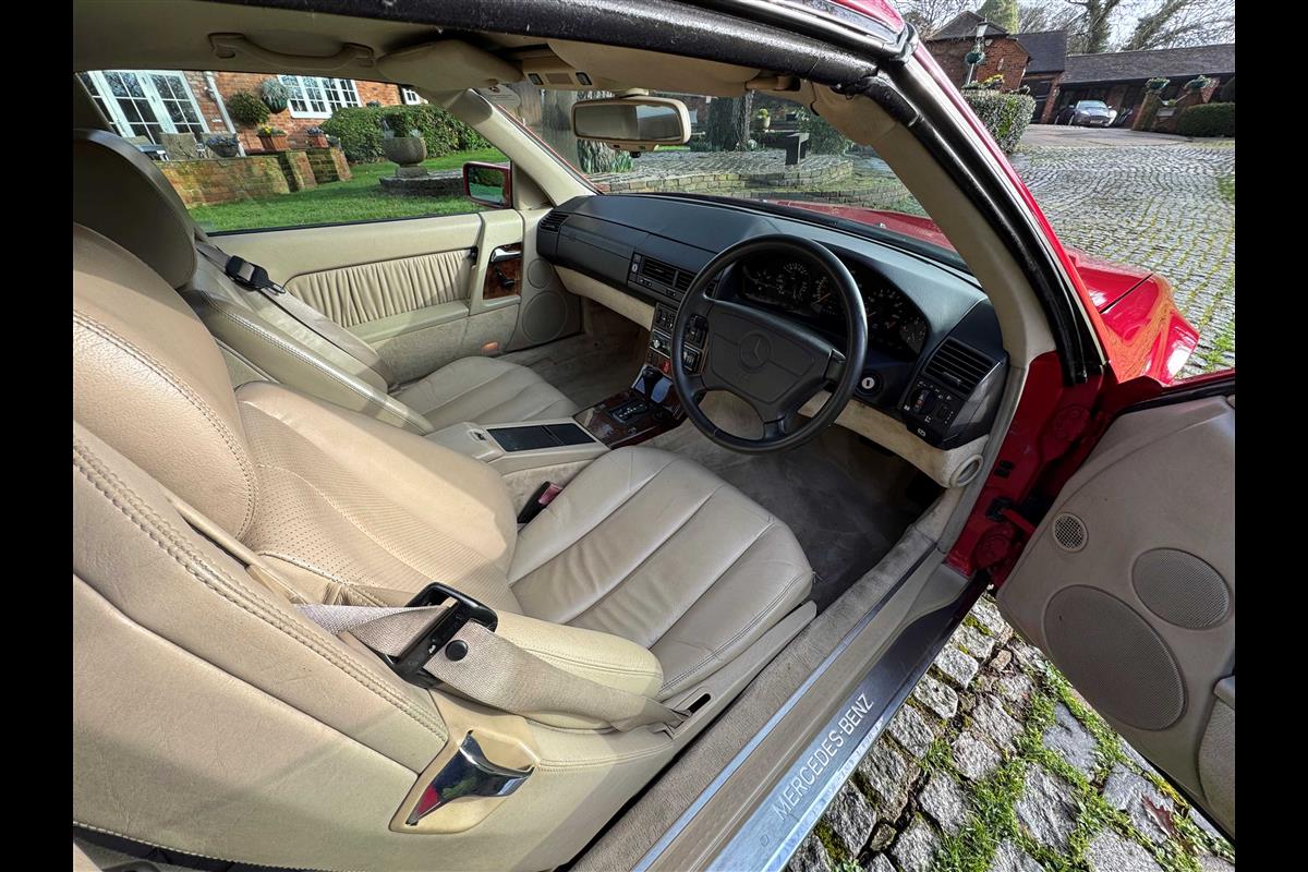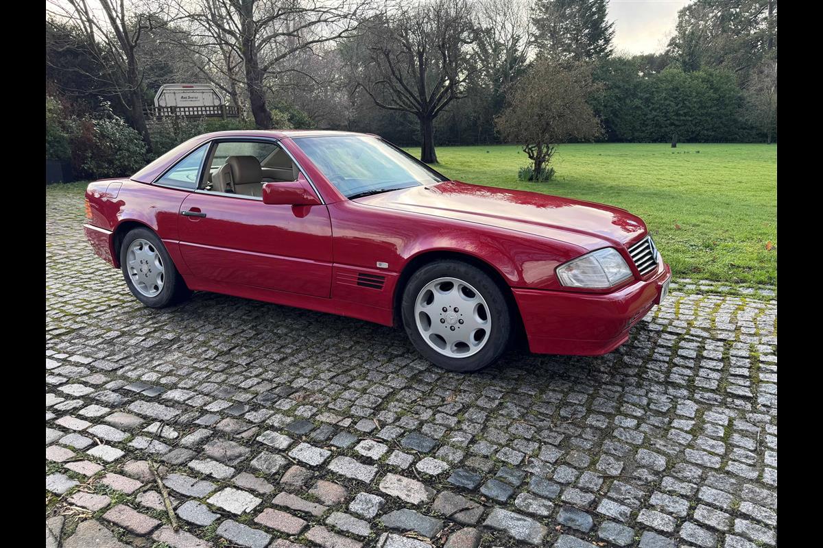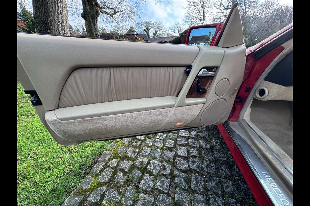 This bright red 1994 Mercedes 280SL has recentley arrived in part exchange against a Bentley Arnage Red Label. Not our normal stock but nevertheless it comes in nice all round condition for an attractive sportscar that is now 32 years old. Mercedes build quality in the early 90's was renowned throughout the motor industry for its superb finish and utter reliability. Both paintwork and interior trim of this motorcar are in very nice condition and judging by the number of service invoices that accompany the car, it has also been well cared for from a mechanical point of view. The interior is very well specified with full leather trim extending to the optional rear seats that are best suited for small children. The interior is complimented with Walnut veneers and the car has a removal hard top, beneath which is an easily errected soft top. The car sits on eight hole Mercedes alloy wheels and is a pleasure to drive. Not expensive in today's market place at £6,950
