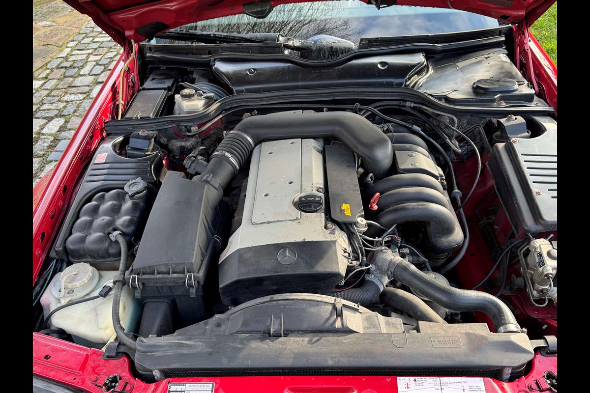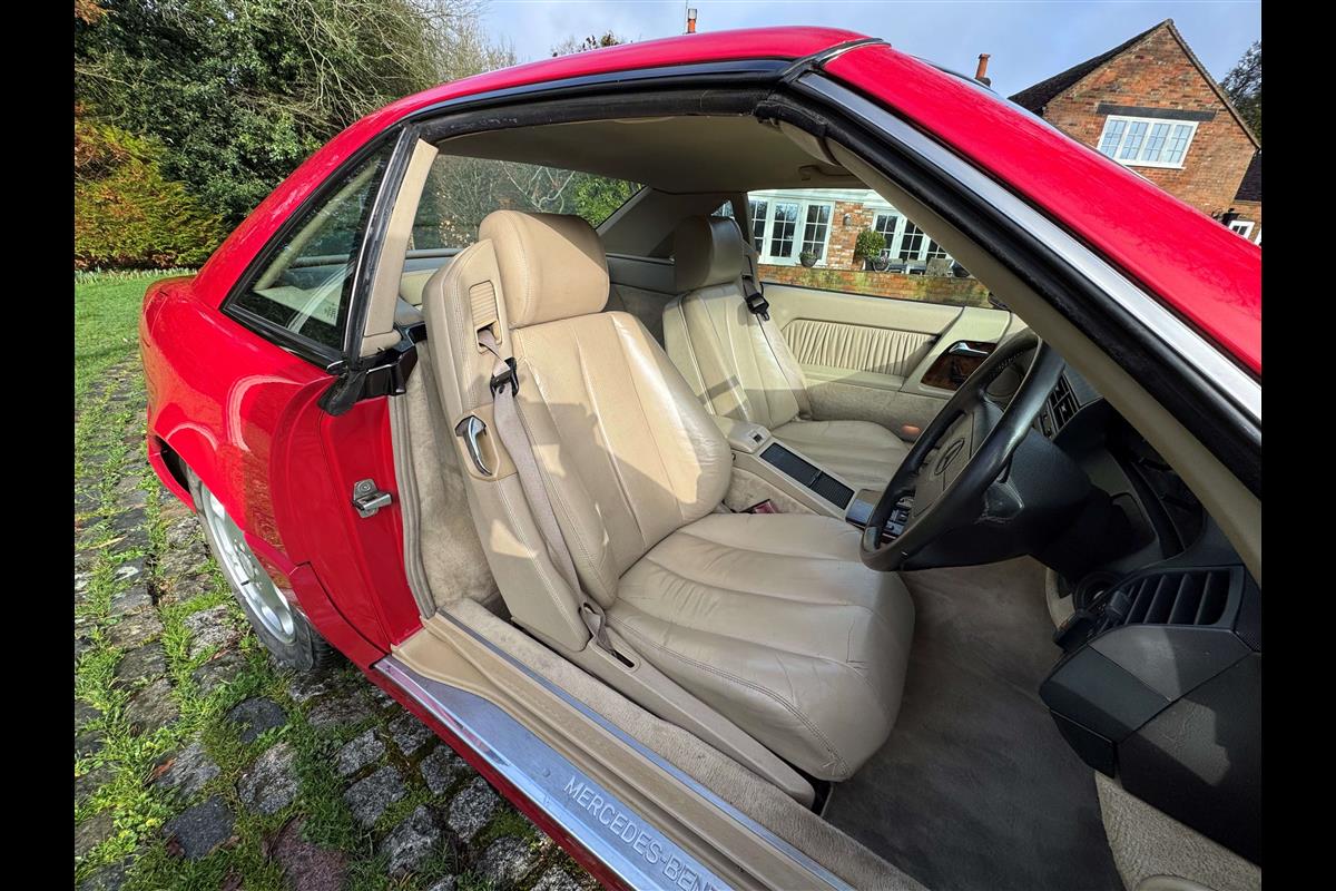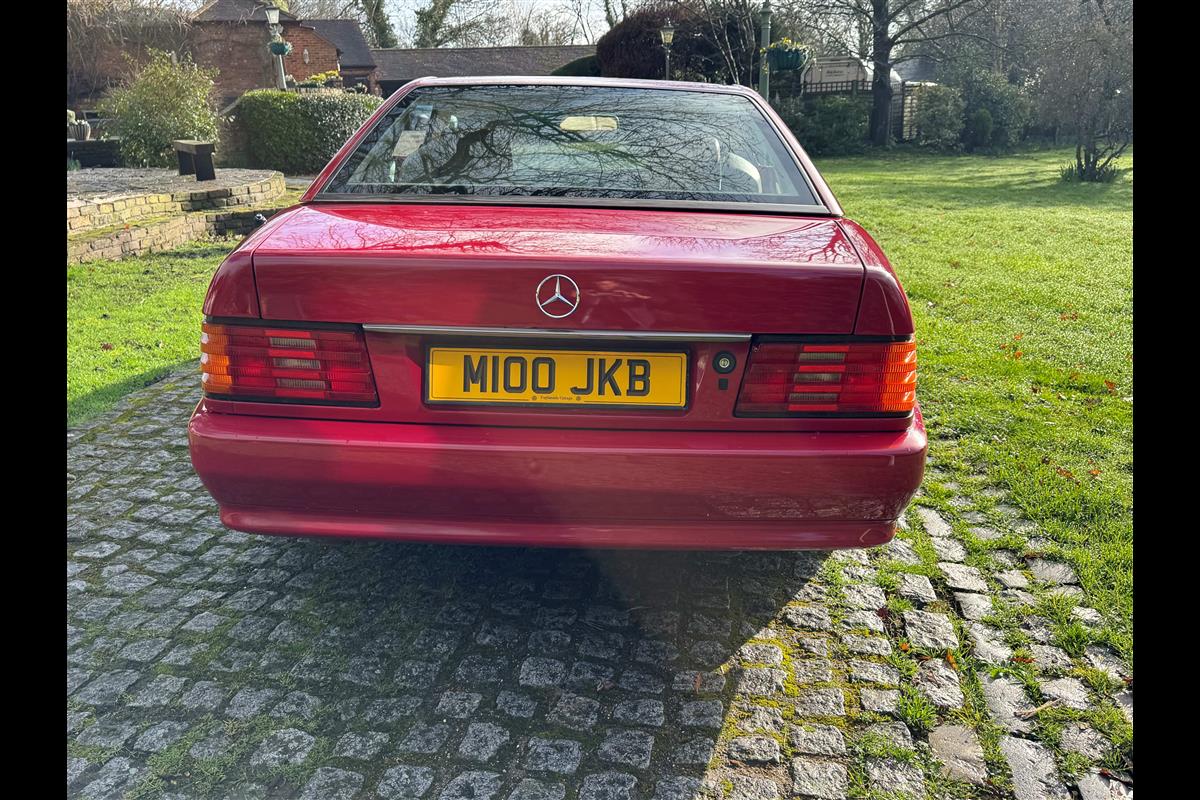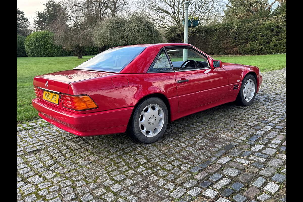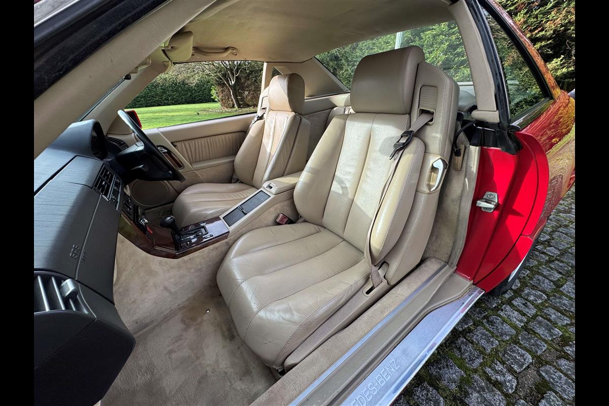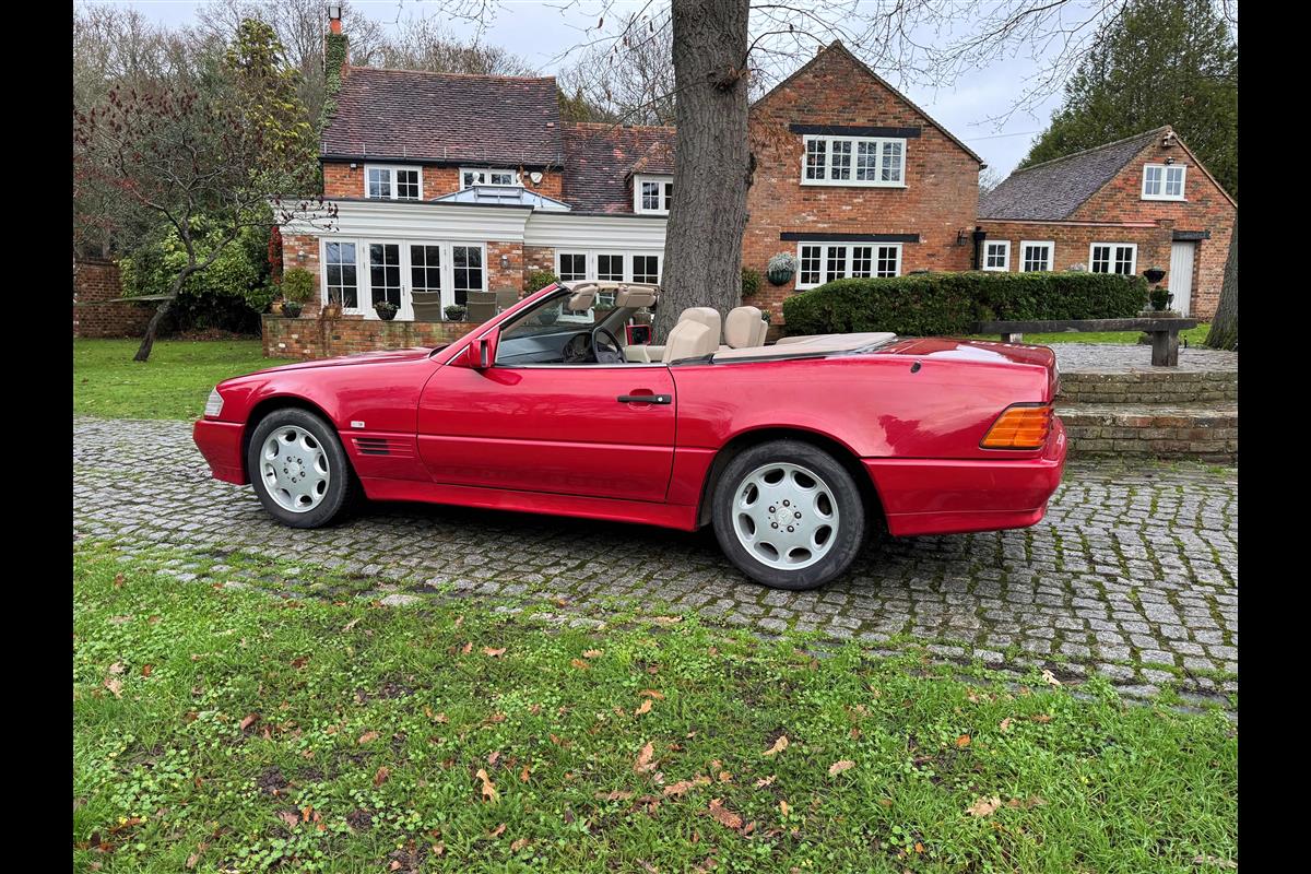 This bright red 1994 Mercedes 280SL has recentley arrived in part exchange against a Bentley Arnage Red Label. Not our normal stock but nevertheless it comes in nice all round condition for an attractive sportscar that is now 32 years old. Mercedes build quality in the early 90's was renowned throughout the motor industry for its superb finish and utter reliability. Both paintwork and interior trim of this motorcar are in very nice condition and judging by the number of service invoices that accompany the car, it has also been well cared for from a mechanical point of view. The interior is very well specified with full leather trim extending to the optional rear seats that are best suited for small children. The interior is complimented with Walnut veneers and the car has a removal hard top, beneath which is an easily errected soft top. The car sits on eight hole Mercedes alloy wheels and is a pleasure to drive. Not expensive in today's market place at £6,950