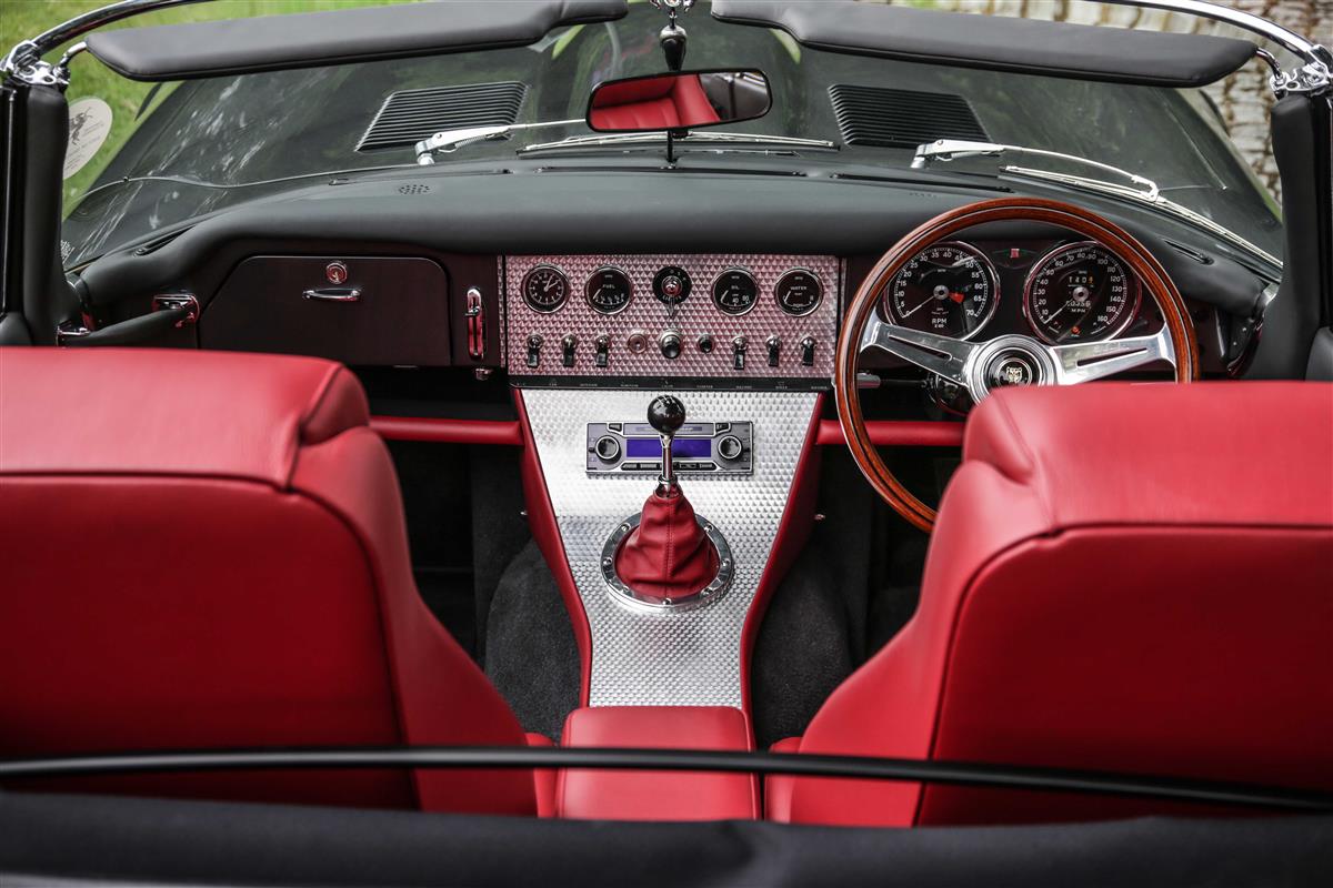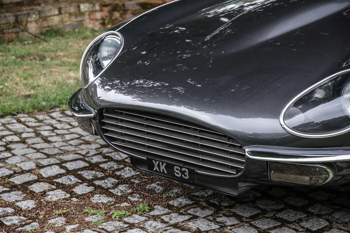 1974 Jaguar E-type Series 3 in McLaren Palladium Silver with red Connolly leather and Wilton carpets. Starting with a matching-numbers roadster, this stunning car has been extensively modified to "Fulfil one man’s dream of the ultimate E-type". Such is its enormous specification that it has to be seen and driven in order to be fully appreciated. Painstakingly created by the craftsmen at Southern Classics, it features reworked front and rear bumpers, a restyled front grille and flared wheelarches that cover 16 x 7.5in wheels. The V12 powerplant has been rebuilt and extended to six litres – running on Jenvey throttle bodies and now producing 450bhp. A five-speed T5 Tremec gearbox has been fitted and the braking, suspension and steering systems have all been upgraded. Subtle interior touches abound, such as Satellite navigation air-conditioning, LED courtesy lights and a beautiful turned-aluminium centre console. The build quality and standard of finish are exquisite throughout and the car drives superbly, rivalling anything built by other well known E type specialists. There’s immense torque from the V12 Engine, the power steering is perfectly weighted, and the suspension upgrades transform the ride and handling. This is a unique opportunity to acquire a bespoke Jaguar E-type, presented in as-new condition having covered less than 400 miles since the build. As 2021 will be the 60th anniversary of the launch of the first E type, the new owner of this magnificent E type will be welcome at the numerous events being planned in celebration. Very realistically priced for a car in this superb condition at £300,000.
