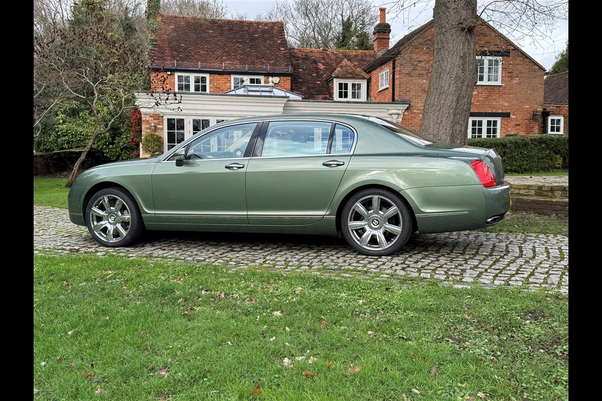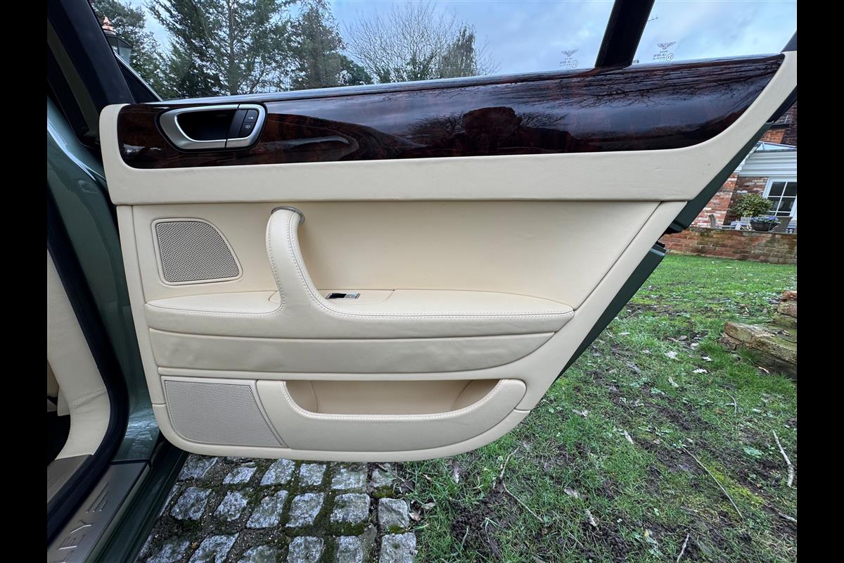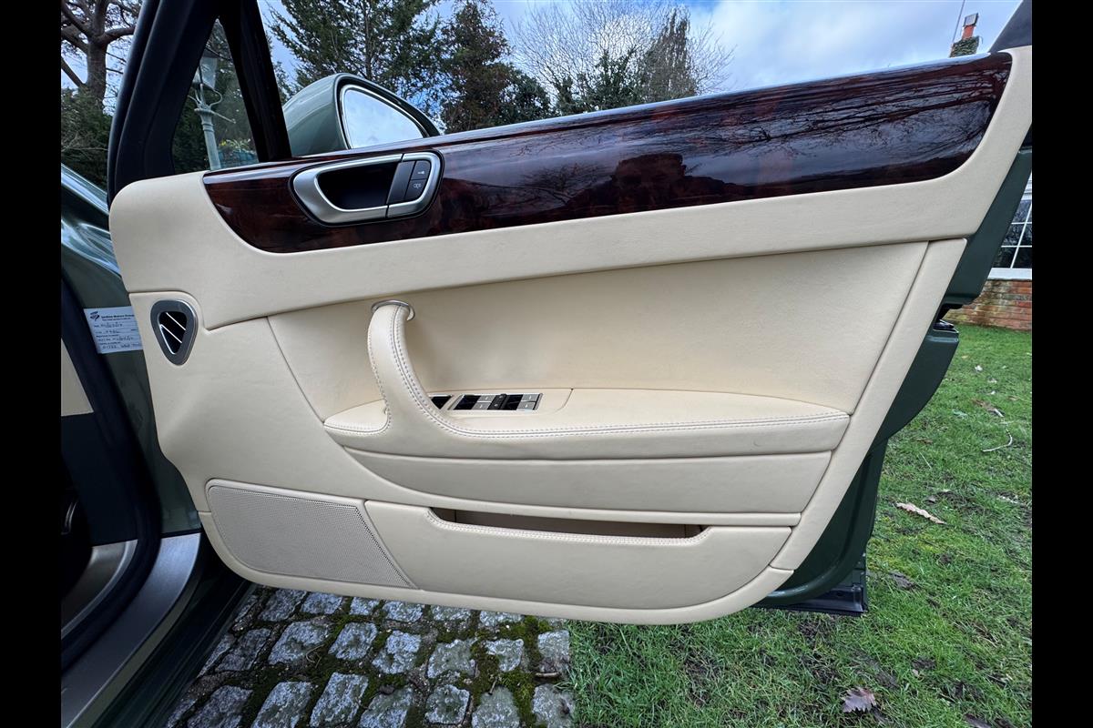This exceptionally low mileage (8,986 miles) 2007 Bentley Continental Flying Spur was purchased from new by the Titled owner in August 2007 and has been used soleley for special occasions. This solitary owner has been a serious collector and car enthusiast for many years and the car has formed part of an interesting and diverse collection. Purchased new from Jack Barclay at a cost of £136,720, the car is finished in a special order colour of Alpine green with a stunning unmarked interior finshed in Magnolia hide with Spruce Dash top, best quality Wilton carpet throughout and Burr Walnut veneered rear picnic tables. The specification further includes a full length rear centre console at a cost of over £4,000, Satelite navigation, TV facility, an electric glass sun roof, 20" chome wheels, a Nav Trac security system and everything else one would expect in a car of this superior quality. It comes supplied with its original Bentley service book with 14 service stamps and a chronologically kept history file and15 mot certificates showing the very gradual progression of the recorded mileage. Unrepeatable value at £22,950