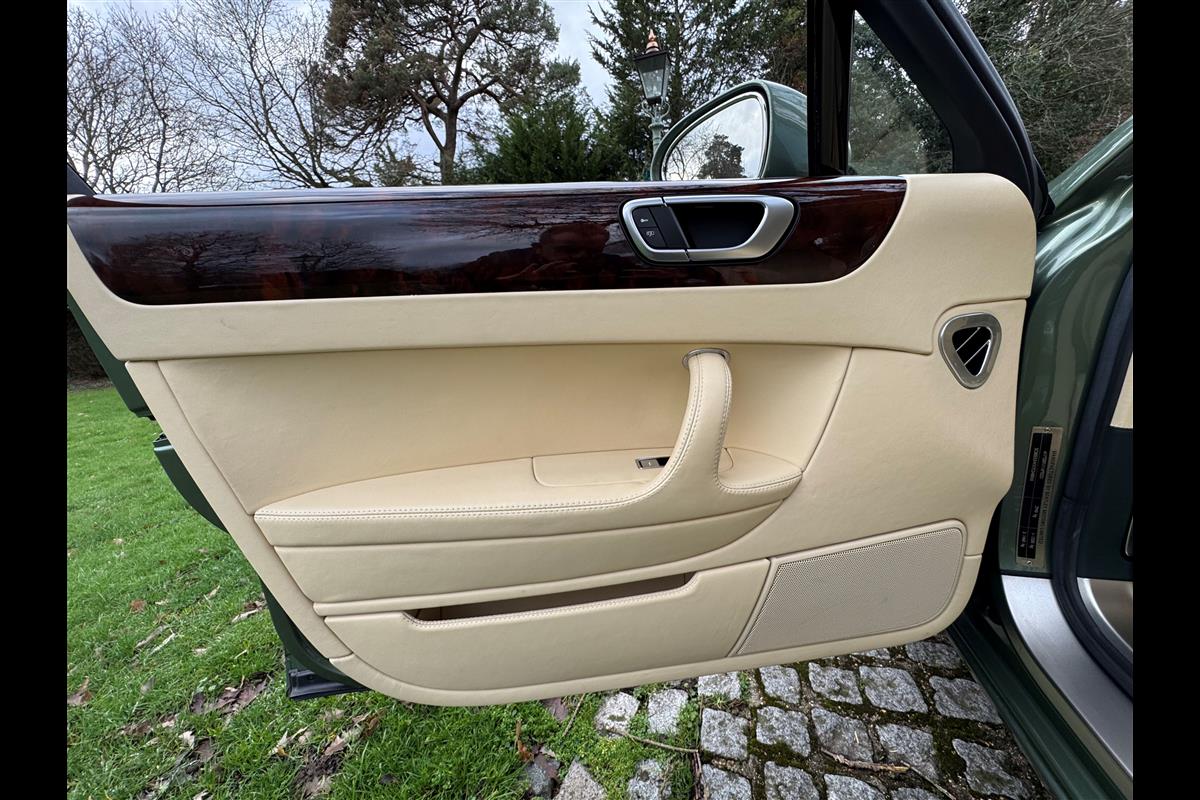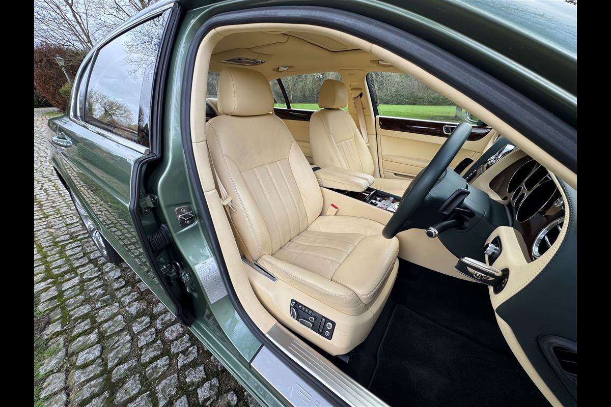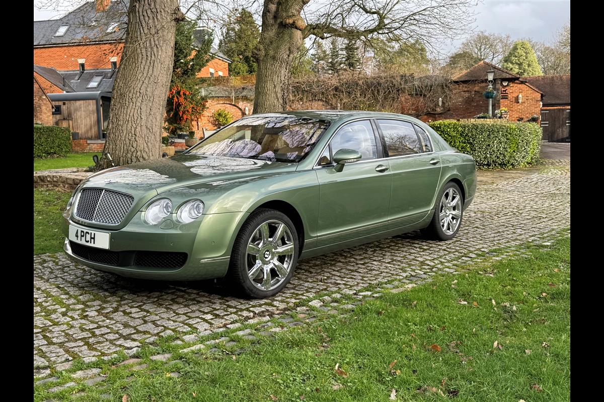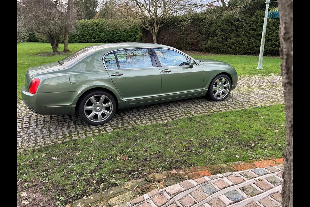 This exceptionally low mileage (8,986 miles) 2007 Bentley Continental Flying Spur was purchased from new by the Titled owner in August 2007 and has been used soleley for special occasions. This solitary owner has been a serious collector and car enthusiast for many years and the car has formed part of an interesting and diverse collection. Purchased new from Jack Barclay at a cost of £136,720, the car is finished in a special order colour of Alpine green with a stunning unmarked interior finshed in Magnolia hide with Spruce Dash top, best quality Wilton carpet throughout and Burr Walnut veneered rear picnic tables. The specification further includes a full length rear centre console at a cost of over £4,000, Satelite navigation, TV facility, an electric glass sun roof, 20" chome wheels, a Nav Trac security system and everything else one would expect in a car of this superior quality. It comes supplied with its original Bentley service book with 14 service stamps and a chronologically kept history file and15 mot certificates showing the very gradual progression of the recorded mileage. Unrepeatable value at £22,950
