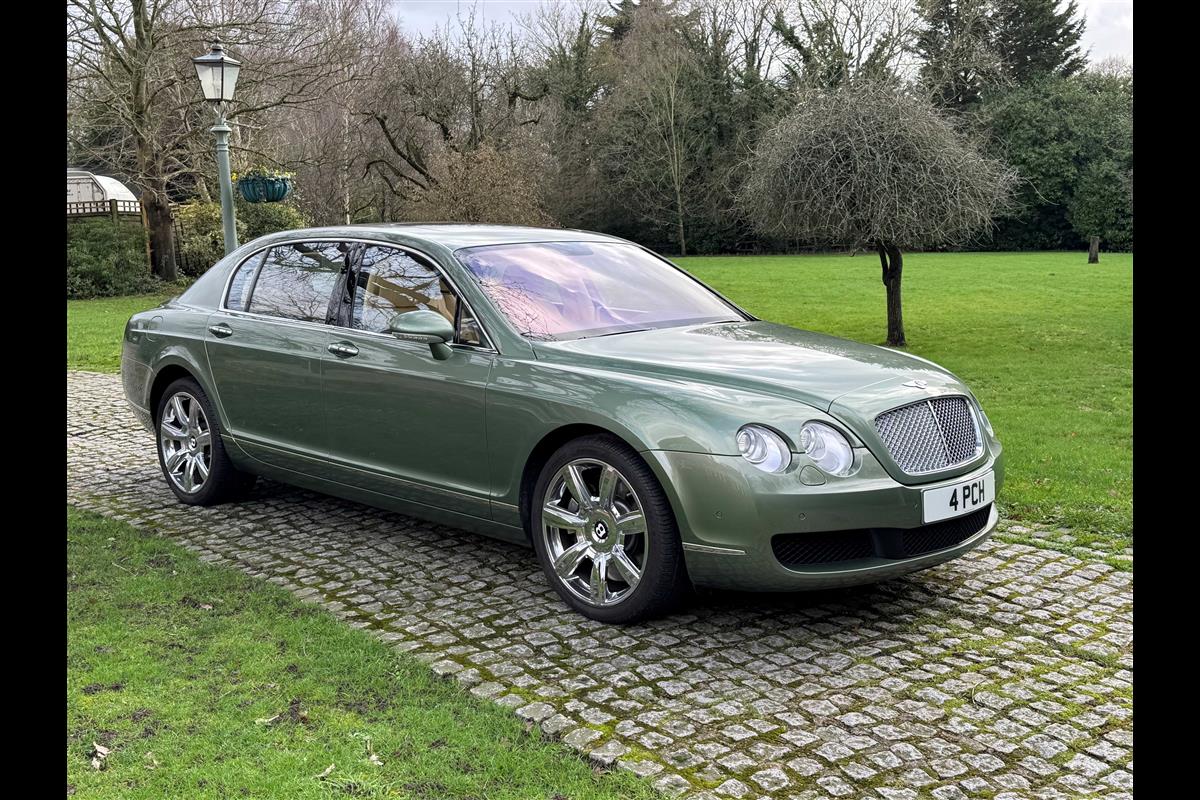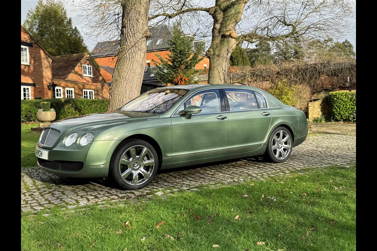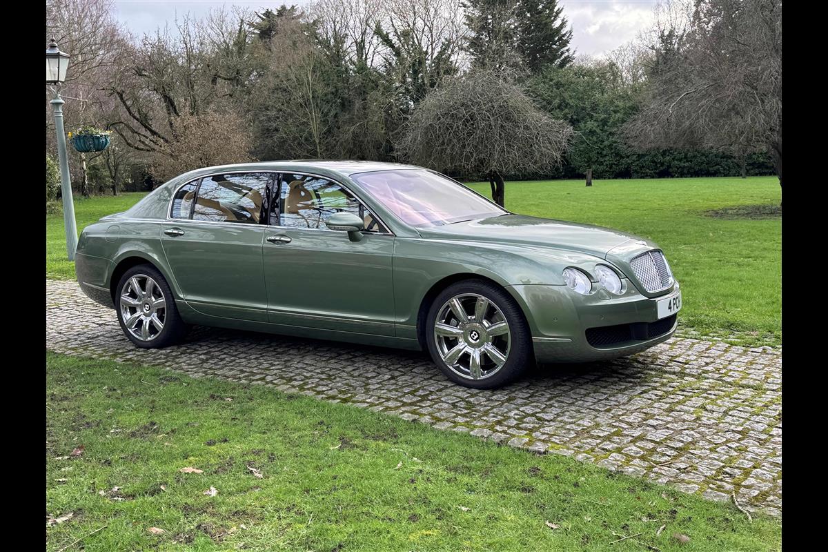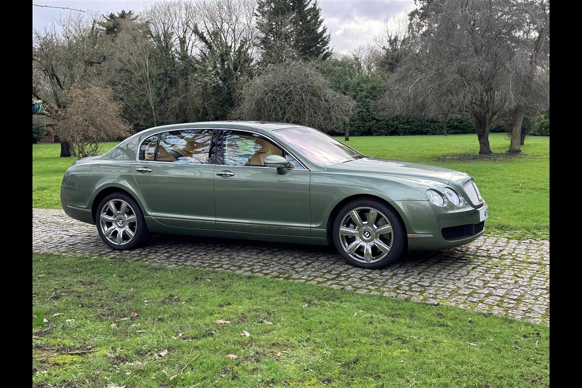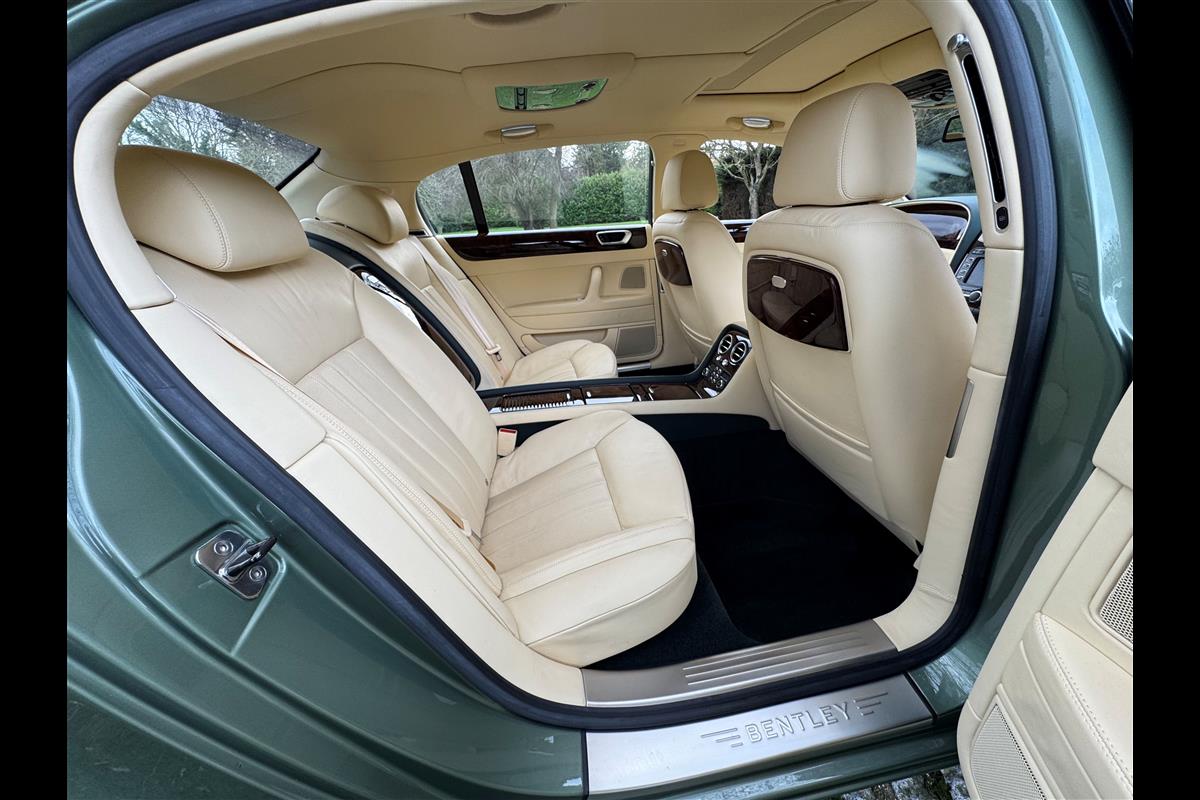 This exceptionally low mileage (8,986 miles) 2007 Bentley Continental Flying Spur was purchased from new by the Titled owner in August 2007 and has been used soleley for special occasions. This solitary owner has been a serious collector and car enthusiast for many years and the car has formed part of an interesting and diverse collection. Purchased new from Jack Barclay at a cost of £136,720, the car is finished in a special order colour of Alpine green with a stunning unmarked interior finshed in Magnolia hide with Spruce Dash top, best quality Wilton carpet throughout and Burr Walnut veneered rear picnic tables. The specification further includes a full length rear centre console at a cost of over £4,000, Satelite navigation, TV facility, an electric glass sun roof, 20" chome wheels, a Nav Trac security system and everything else one would expect in a car of this superior quality. It comes supplied with its original Bentley service book with 14 service stamps and a chronologically kept history file and15 mot certificates showing the very gradual progression of the recorded mileage. Unrepeatable value at £22,950