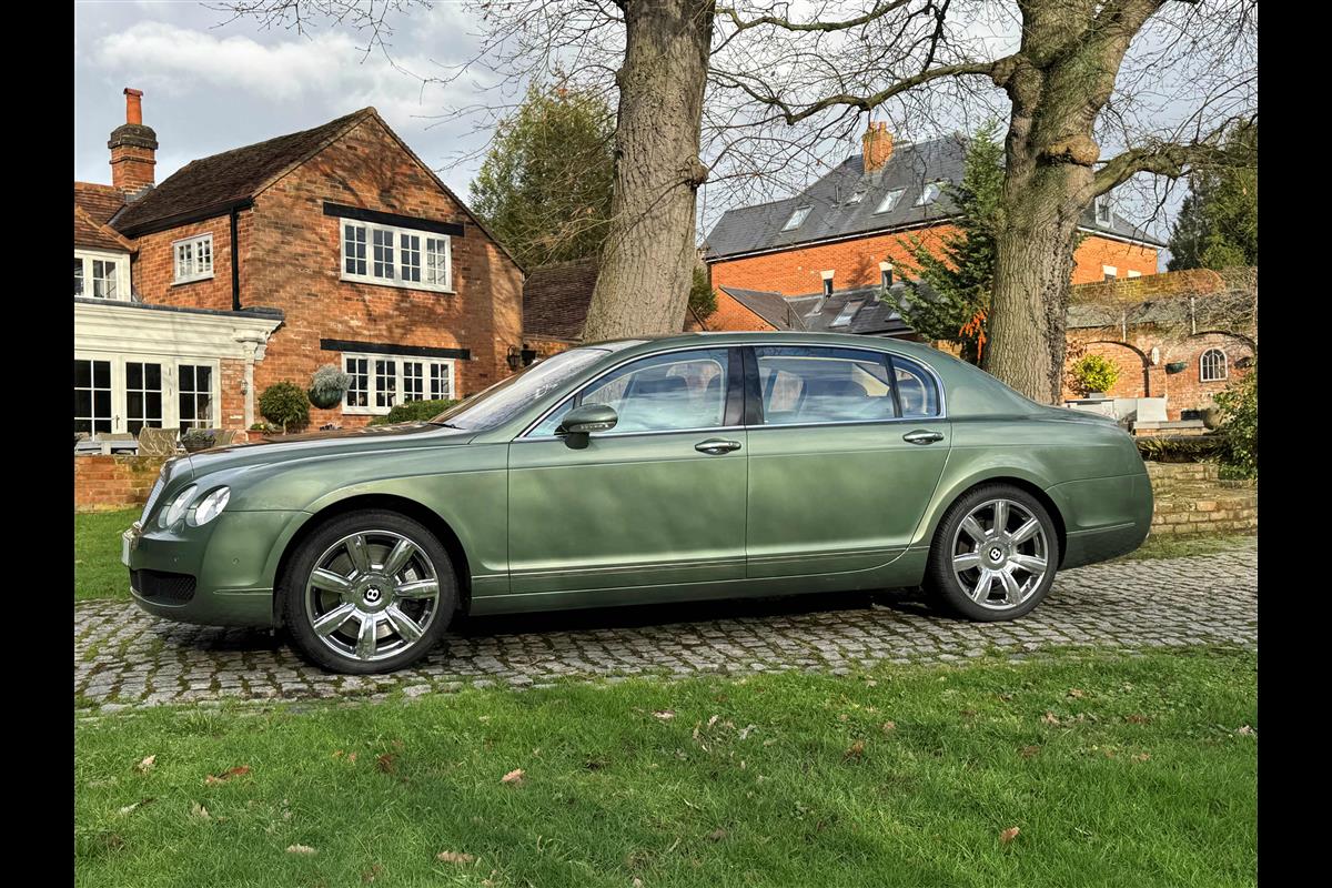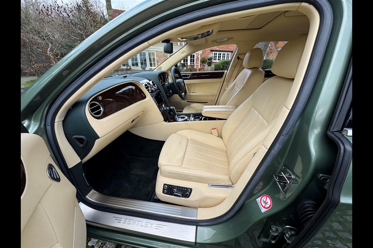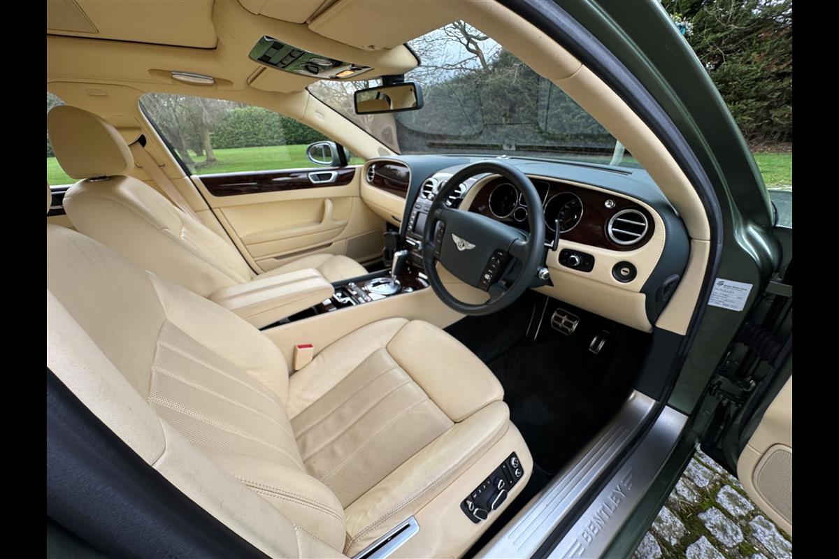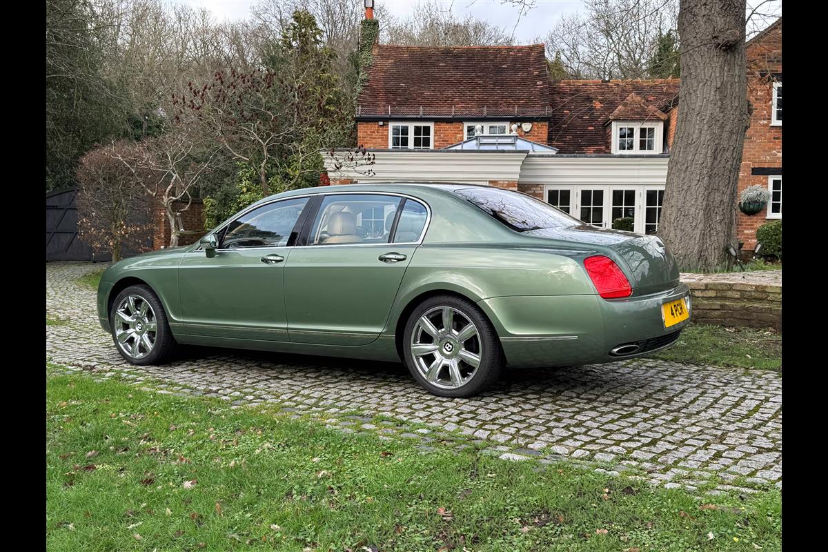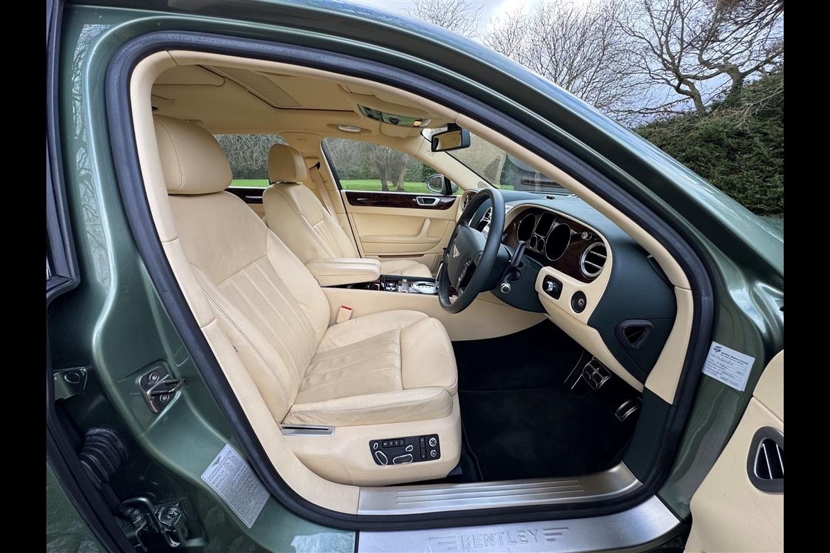 This exceptionally low mileage (8,986 miles) 2007 Bentley Continental Flying Spur was purchased from new by the Titled owner in August 2007 and has been used soleley for special occasions. This solitary owner has been a serious collector and car enthusiast for many years and the car has formed part of an interesting and diverse collection. Purchased new from Jack Barclay at a cost of £136,720, the car is finished in a special order colour of Alpine green with a stunning unmarked interior finshed in Magnolia hide with Spruce Dash top, best quality Wilton carpet throughout and Burr Walnut veneered rear picnic tables. The specification further includes a full length rear centre console at a cost of over £4,000, Satelite navigation, TV facility, an electric glass sun roof, 20" chome wheels, a Nav Trac security system and everything else one would expect in a car of this superior quality. It comes supplied with its original Bentley service book with 14 service stamps and a chronologically kept history file and15 mot certificates showing the very gradual progression of the recorded mileage. Unrepeatable value at £22,950