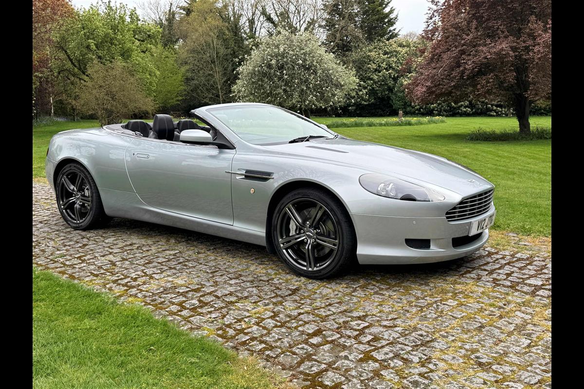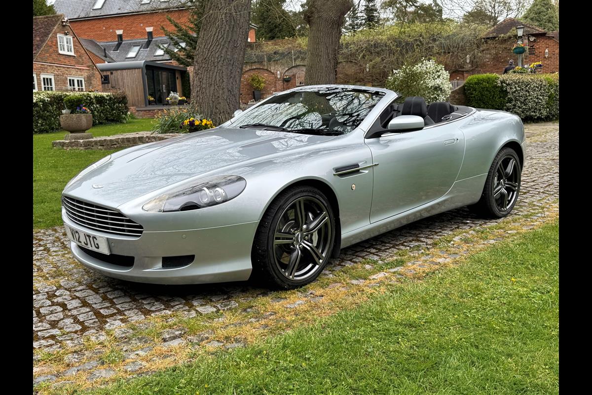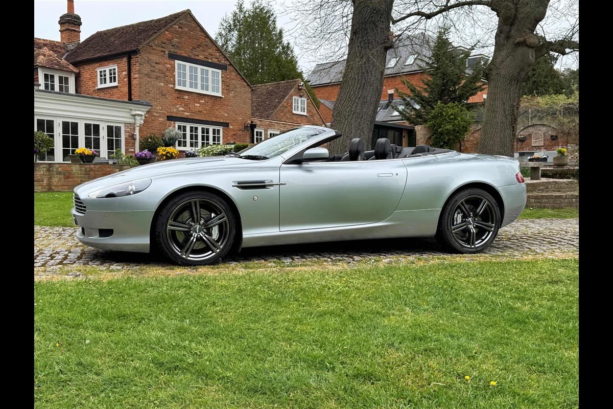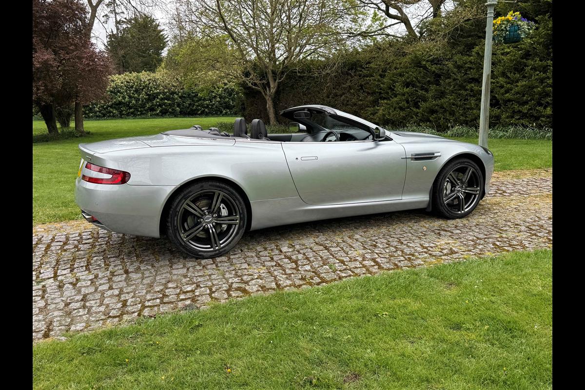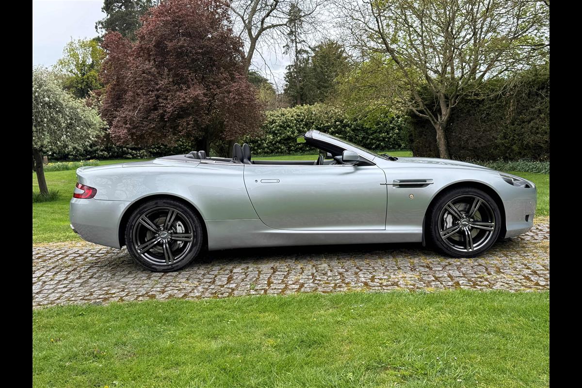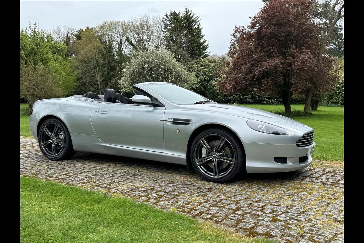 2009 Aston Martin DB9 Volante finished in Titainium Silver with Obsidian black hide interior with contrasting white stitching and a fully retractable black mohair soft top. This superb low mileage example comes with a fully stamped up service book with 17 service stamps from Aston Martin main dealers and the final stamp from a well respected Aston Martin specialist. The car is in unmarked condition both inside and out and the specification includes a Piano black centre console complete with Glass key, Charcoal headlining, electric heated seats with lumbar support, Satelite navigation and cruise control. The DB9 provides an effortless driving experience and it is rare to find a 17 year old example with such low mileage in this exceptional condition.