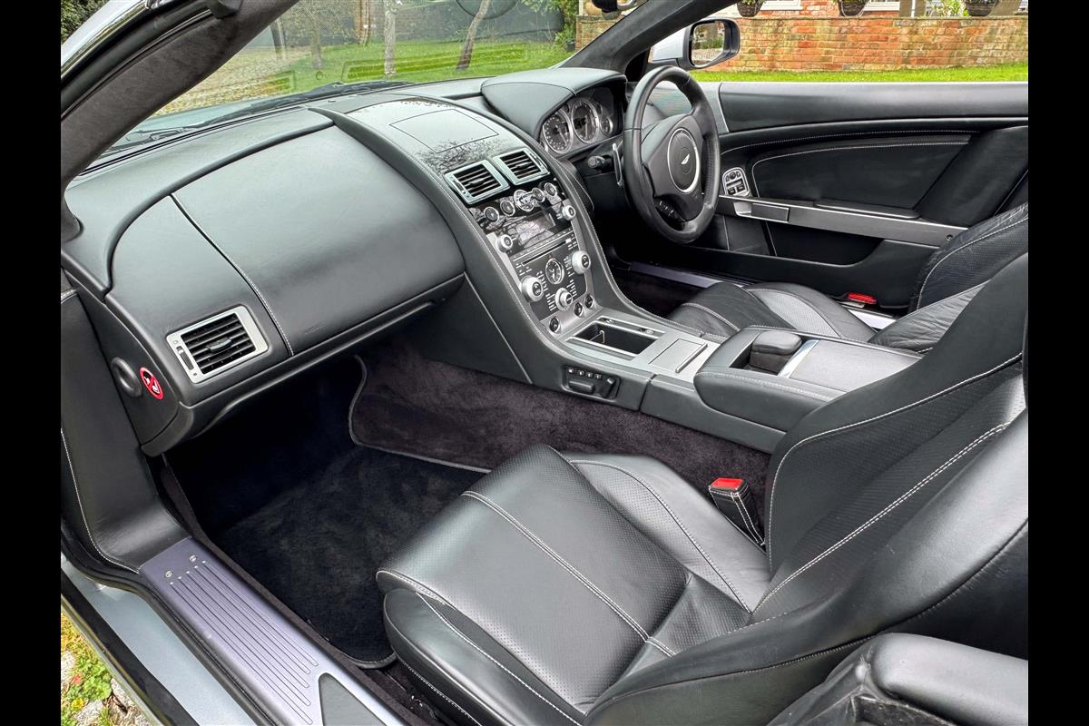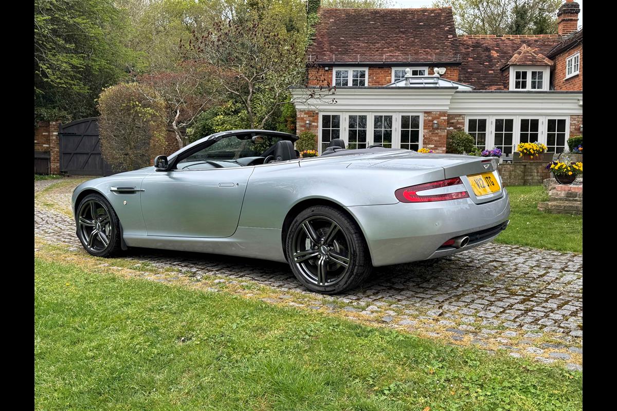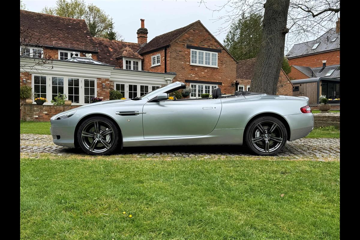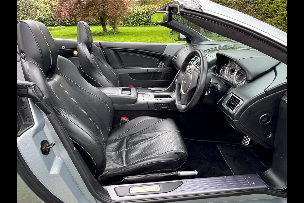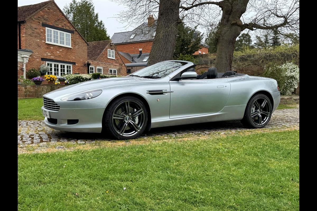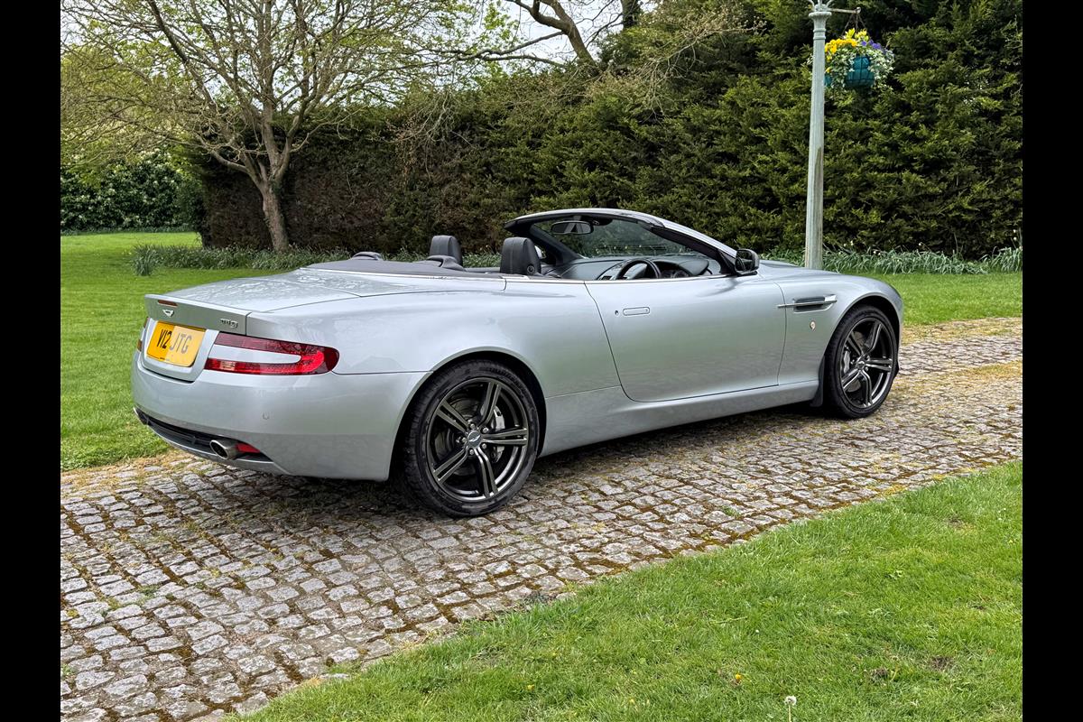 2009 Aston Martin DB9 Volante finished in Titainium Silver with Obsidian black hide interior with contrasting white stitching and a fully retractable black mohair soft top. This superb low mileage example comes with a fully stamped up service book with 17 service stamps from Aston Martin main dealers and the final stamp from a well respected Aston Martin specialist. The car is in unmarked condition both inside and out and the specification includes a Piano black centre console complete with Glass key, Charcoal headlining, electric heated seats with lumbar support, Satelite navigation and cruise control. The DB9 provides an effortless driving experience and it is rare to find a 17 year old example with such low mileage in this exceptional condition.