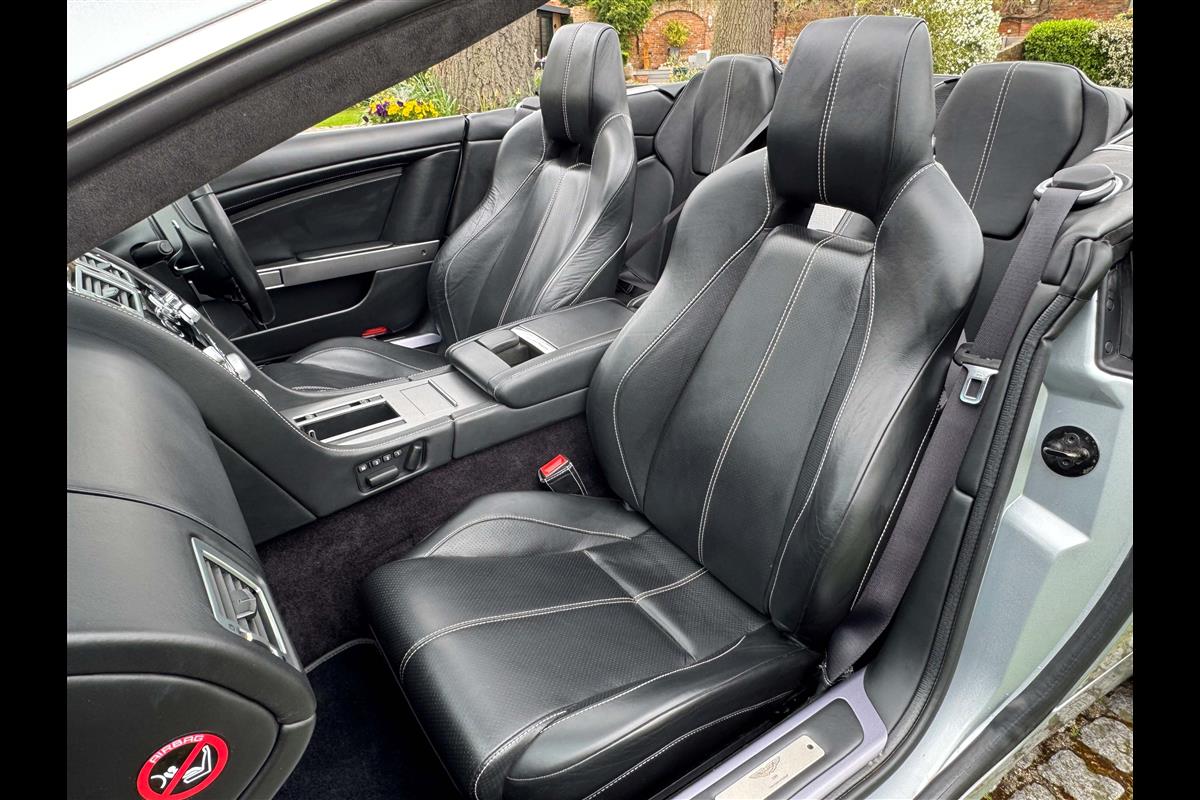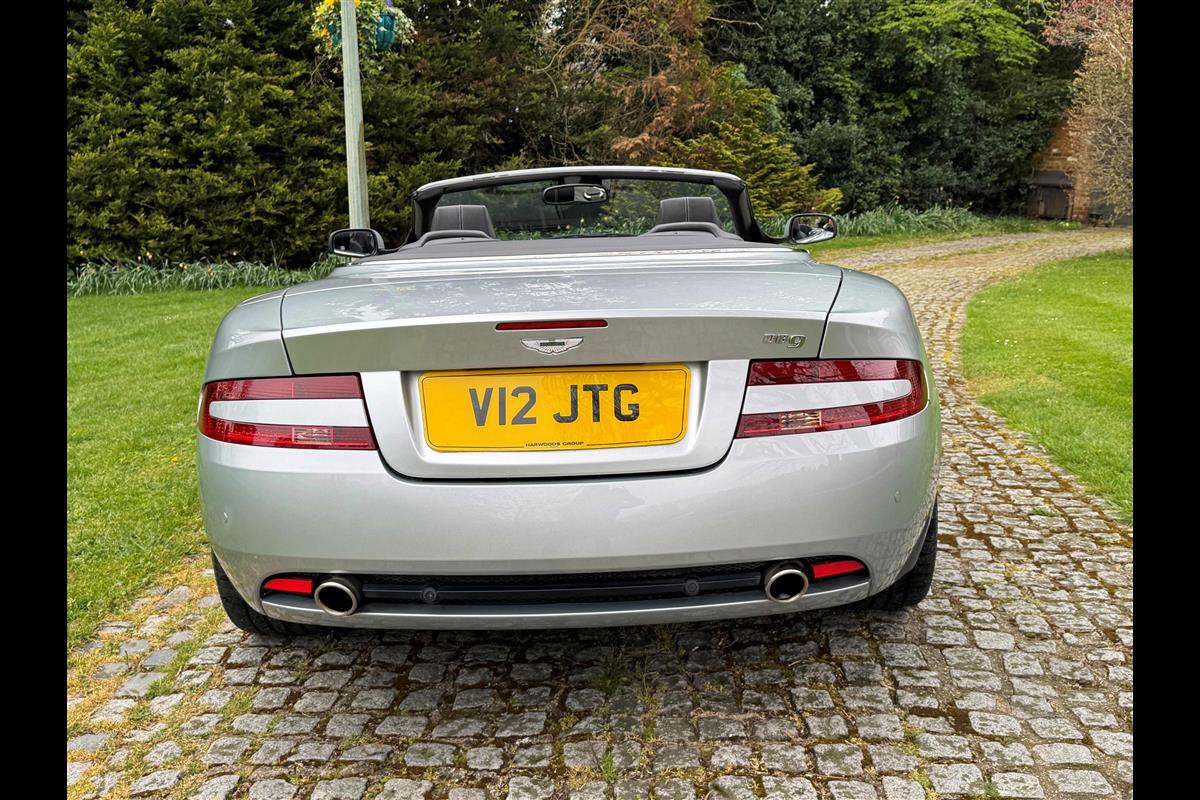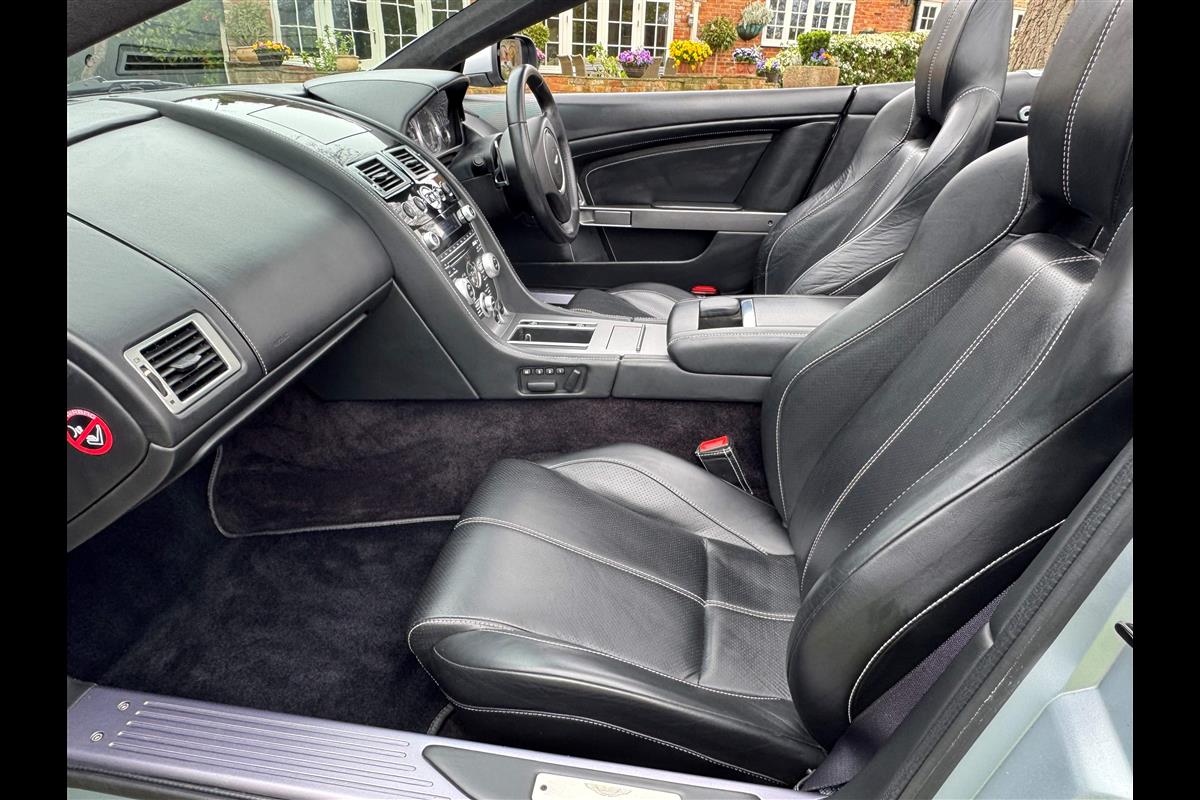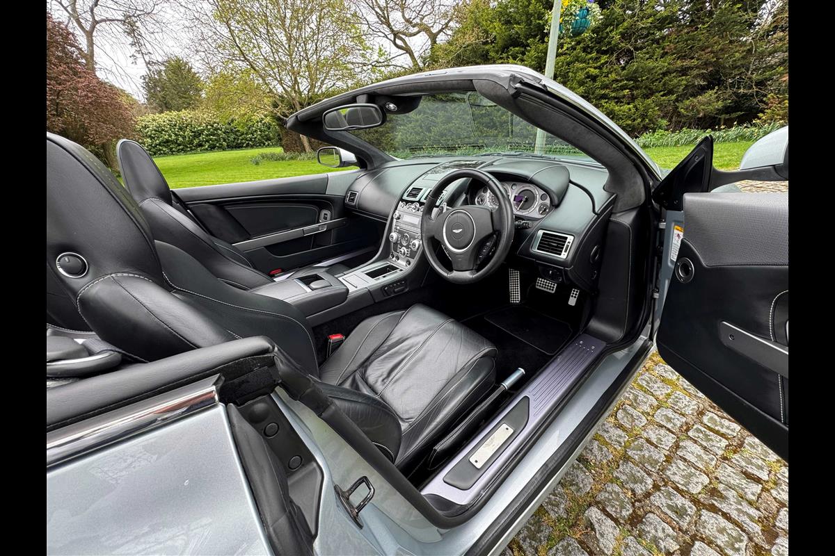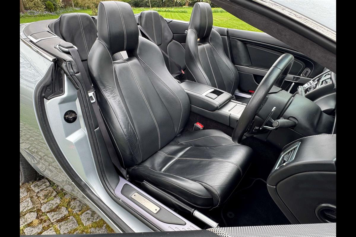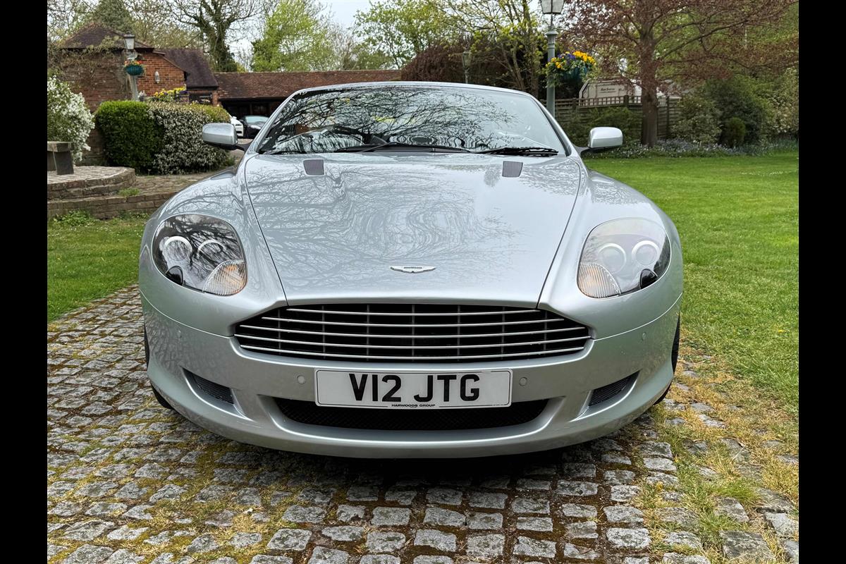 2009 Aston Martin DB9 Volante finished in Titainium Silver with Obsidian black hide interior with contrasting white stitching and a fully retractable black mohair soft top. This superb low mileage example comes with a fully stamped up service book with 17 service stamps from Aston Martin main dealers and the final stamp from a well respected Aston Martin specialist. The car is in unmarked condition both inside and out and the specification includes a Piano black centre console complete with Glass key, Charcoal headlining, electric heated seats with lumbar support, Satelite navigation and cruise control. The DB9 provides an effortless driving experience and it is rare to find a 17 year old example with such low mileage in this exceptional condition.